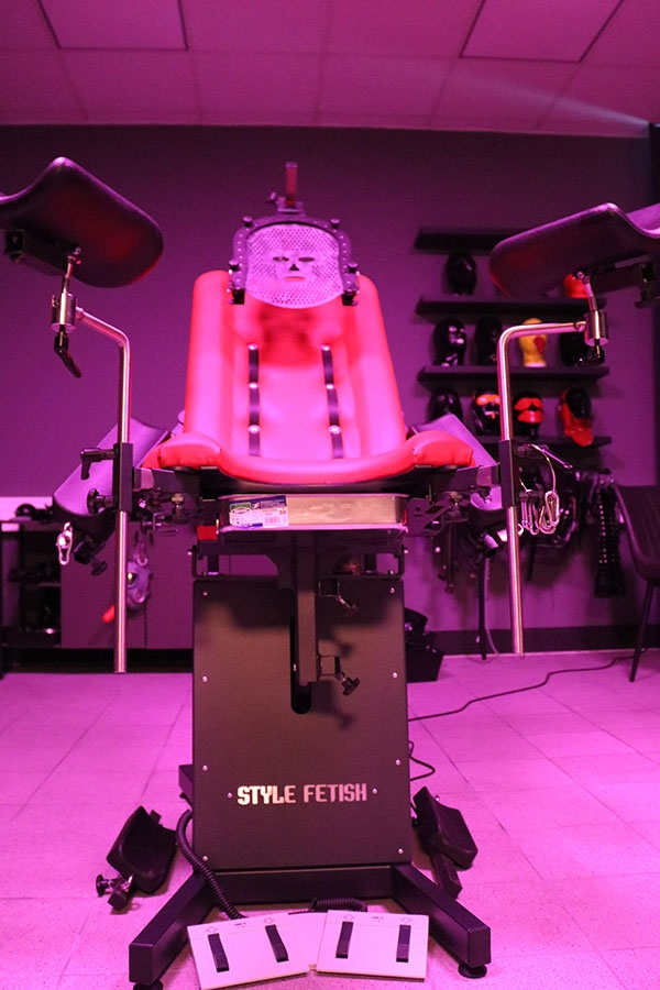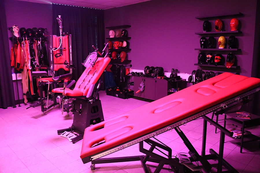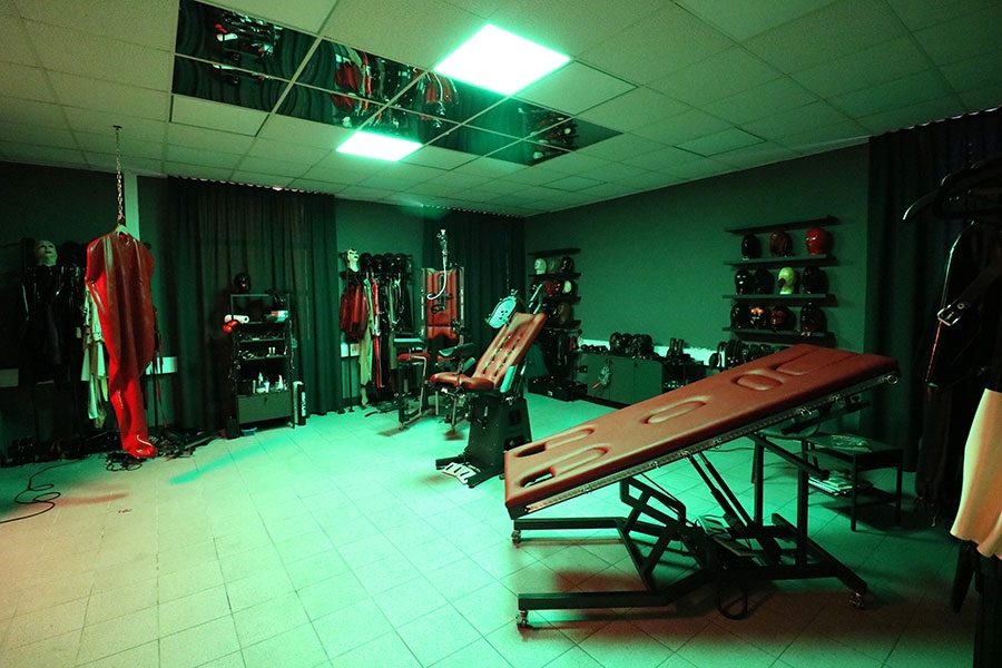 Das Gummizimmer ist ein wahrer Traum für jeden Gummi- und Latexfetischisten. Auf 62 qm voller Latex und dessen Geruchs gibt es alles, um diesen Fetisch in jeder Form auszuleben. Die funktionellen Möbel, wie elektrisch aufstellbare Bondage-Liege, elektrischer Sklaven-Stuhl und elektrischer Gyn-Stuhl in Rot mit Anthrazit-Finish bieten einen Kontrast zu graufarbenen Wänden und umfangreicher Latex Ausstattung, die den Raum nicht nur schmückt, aber auch als Outfit-Anregung für den Besucher bietet.