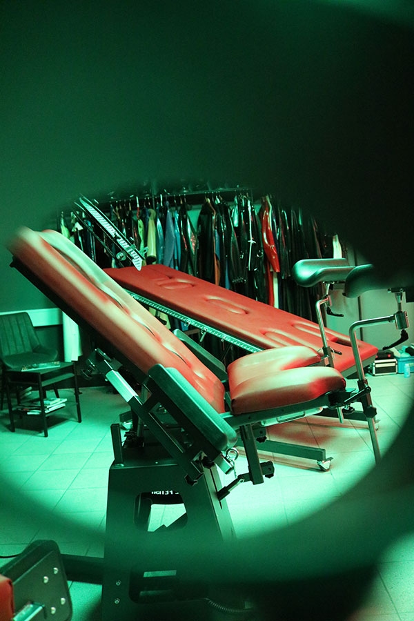 Das repräsentative stimmungsvolle 46 qm große Leder- und Bondage-Zimmer mit originellen Holz-Leder-Möbeln, wie große Streckbank, Strafbock und Andreaskreuz in warmen Lederfarben und echter Mid-Century-Design-Einrichtung lädt den Besucher auf eine bizarre Reise ein.
